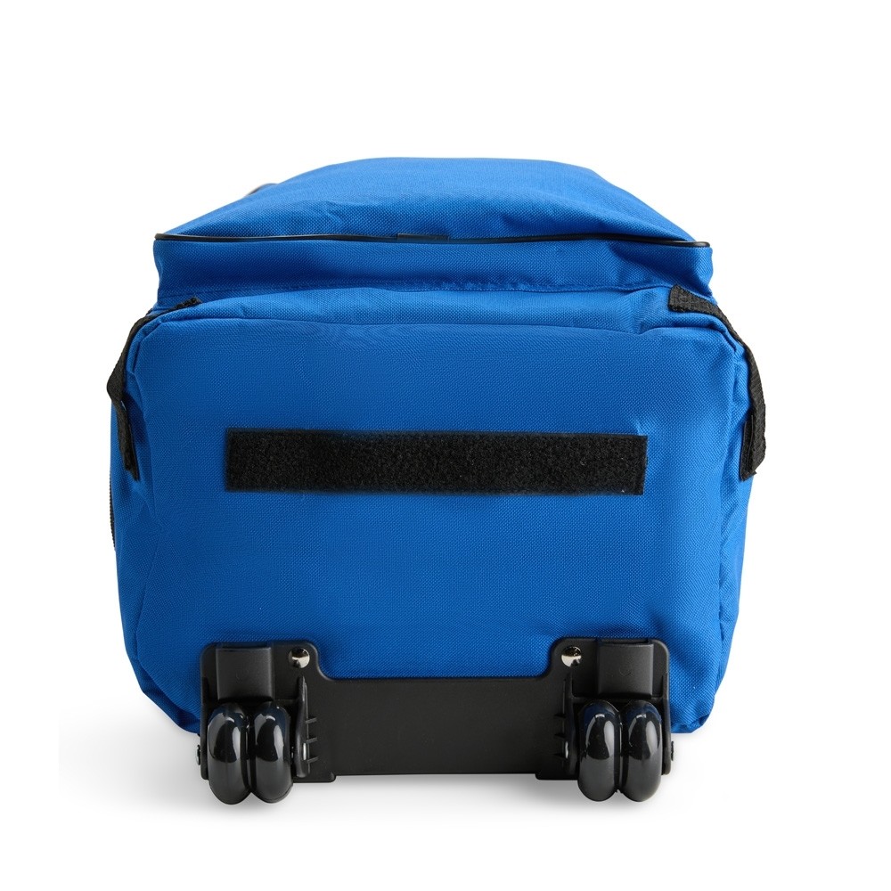 Bolsa térmica confeccionada em poliéster resistente à água e capacidade máxima de 30 litros. Possui compartimento interno com revestimento em PEVA atóxico antivazamento. Dispõe de quatro rodinhas, alça metálica com puxador em plástico, além de freios removíveis com encaixe firme em velcro. Conta ainda com bolso frontal com zíper e dois laterais em tela de nylon.