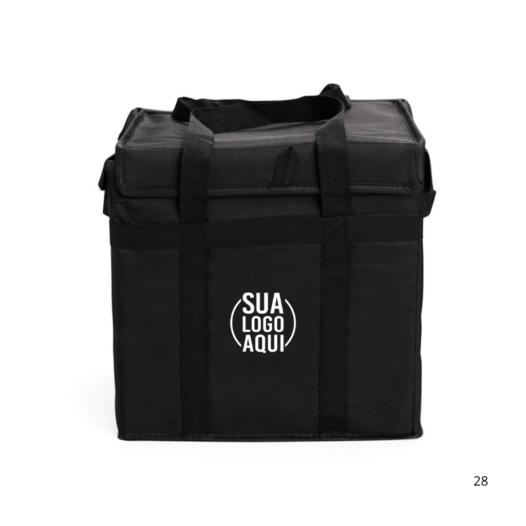 Bolsa térmica confeccionada em Oxford impermeável, fechamento em velcro e capacidade máxima de 35 litros. Conta com armação interna em placa de PVC e junção inferior em velcro, que facilita o transporte quando a bolsa não estiver em uso. Possui revestimento térmico interno em folha de alumínio e um par de alças de nylon para transporte.