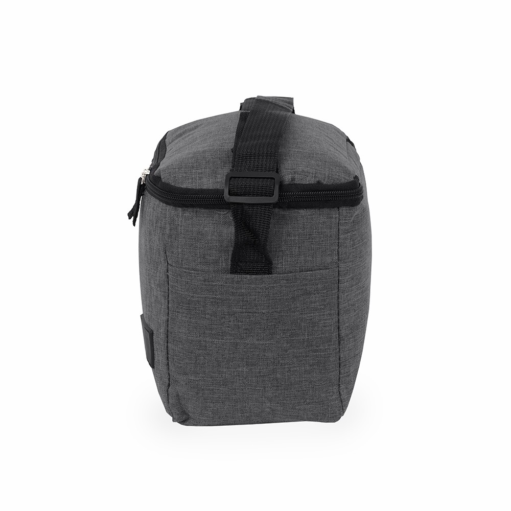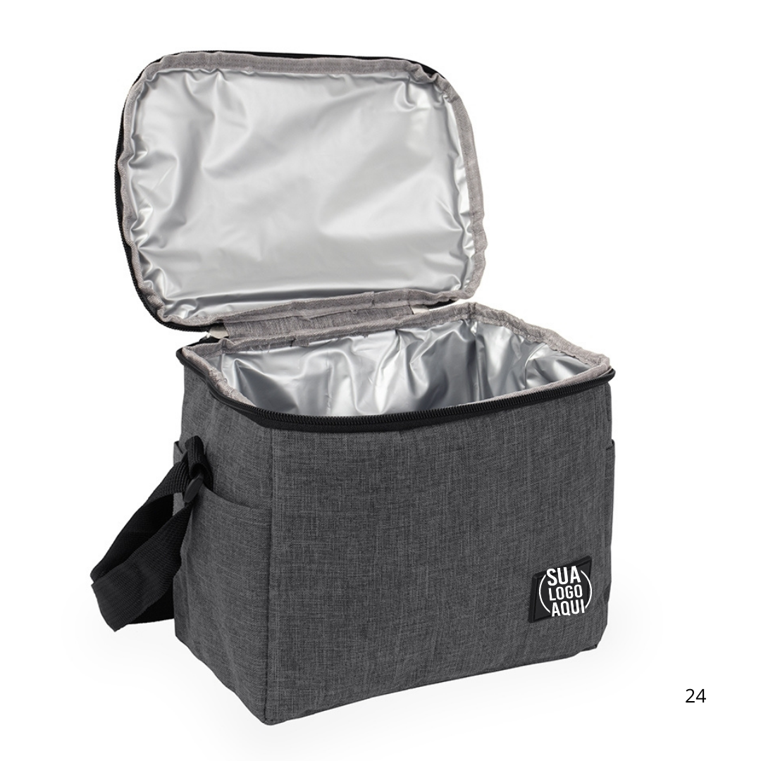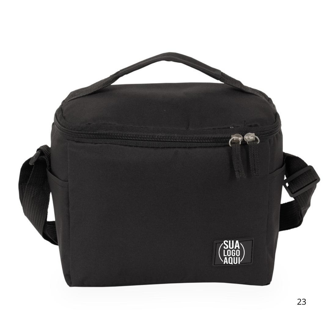 Bolsa térmica confeccionada em Oxford 300D resistente à água com capacidade máxima de 6 litros, fechamento em zíper e plaquinha personalizável em plástico costurada na parte frontal. Possui revestimento térmico antivazamento em PEVA, dois bolsos laterais, alça de mão superior e alça transversal ajustável.