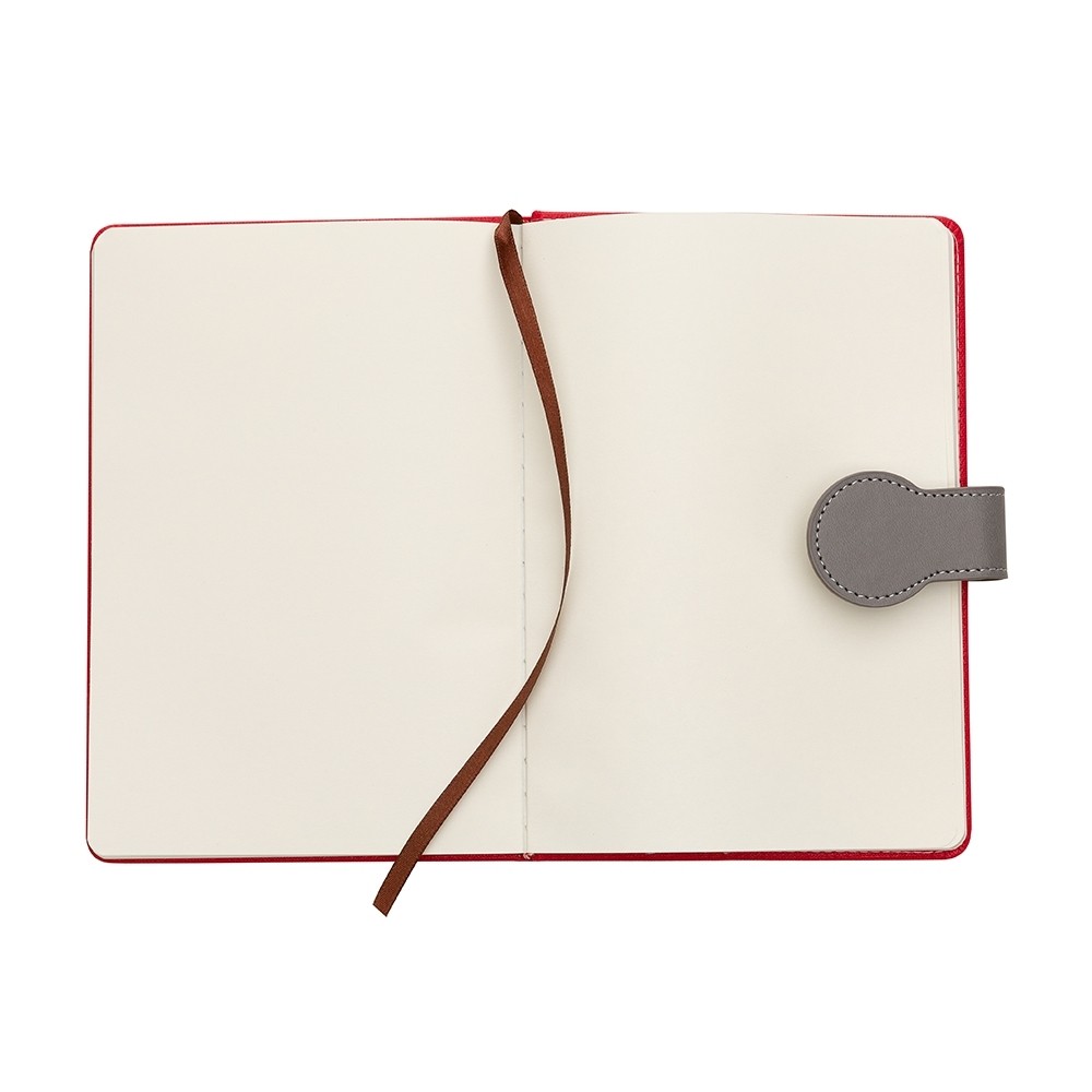 Caderneta sintética com fechamento imantado, contém aproximadamente 96 folhas amarelas sem pauta e marcador de página em cetim.