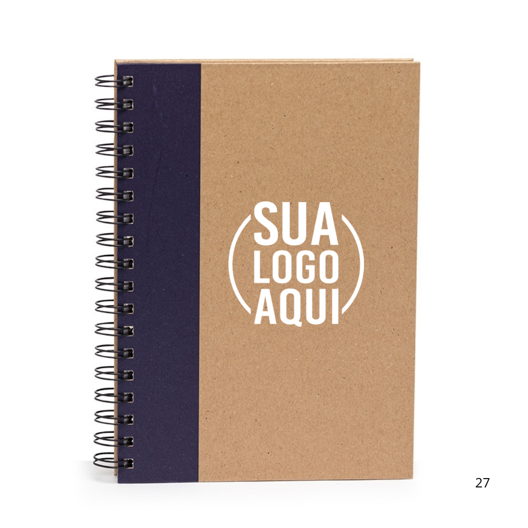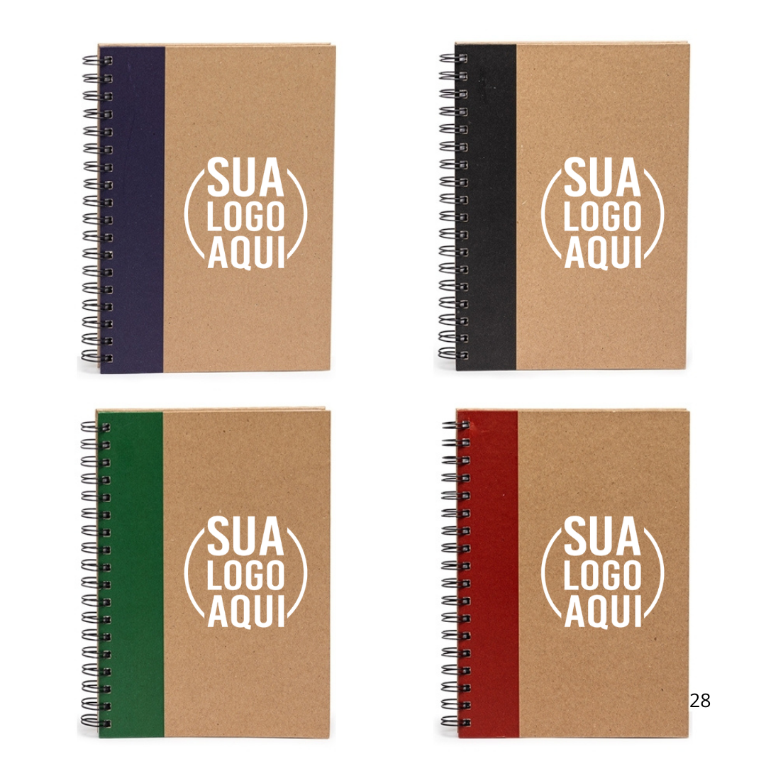Caderno com capa kraft e espiral metálico. Possui aproximadamente 85 folhas brancas pautadas e folhas destinadas aos dados pessoais, calendário de 2024 à 2026, planejamento e contatos.