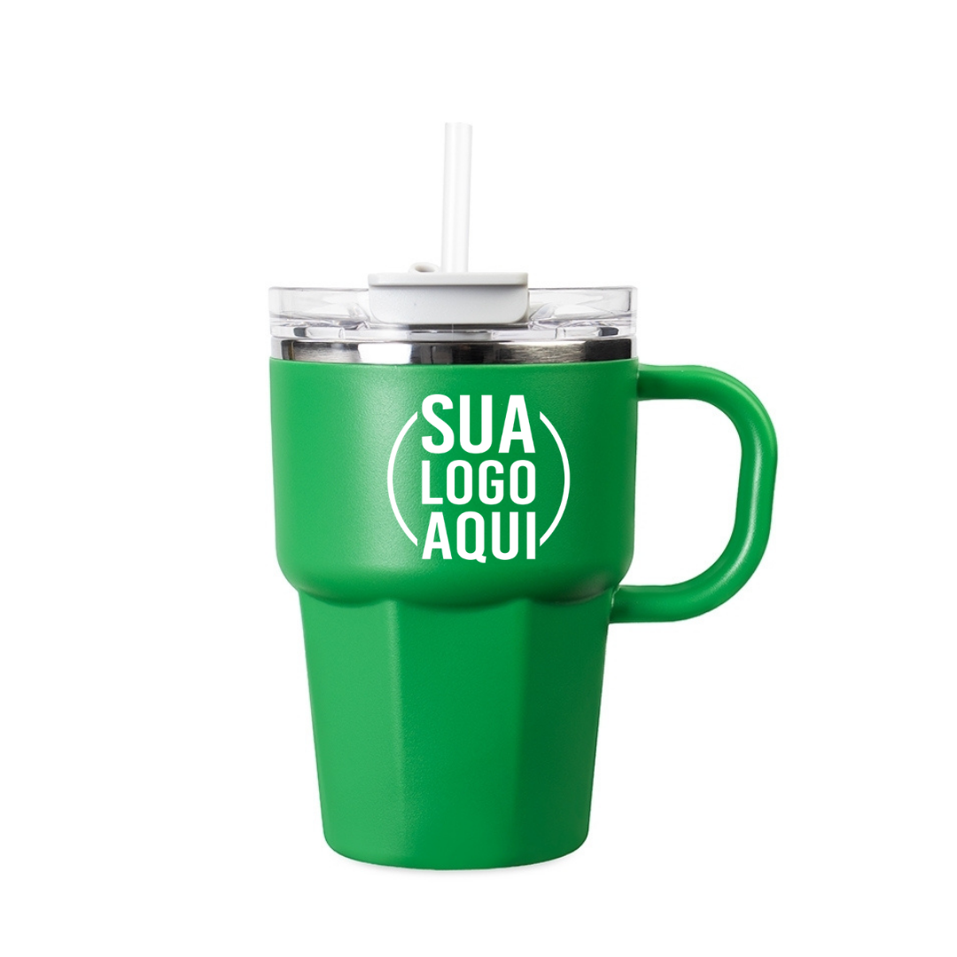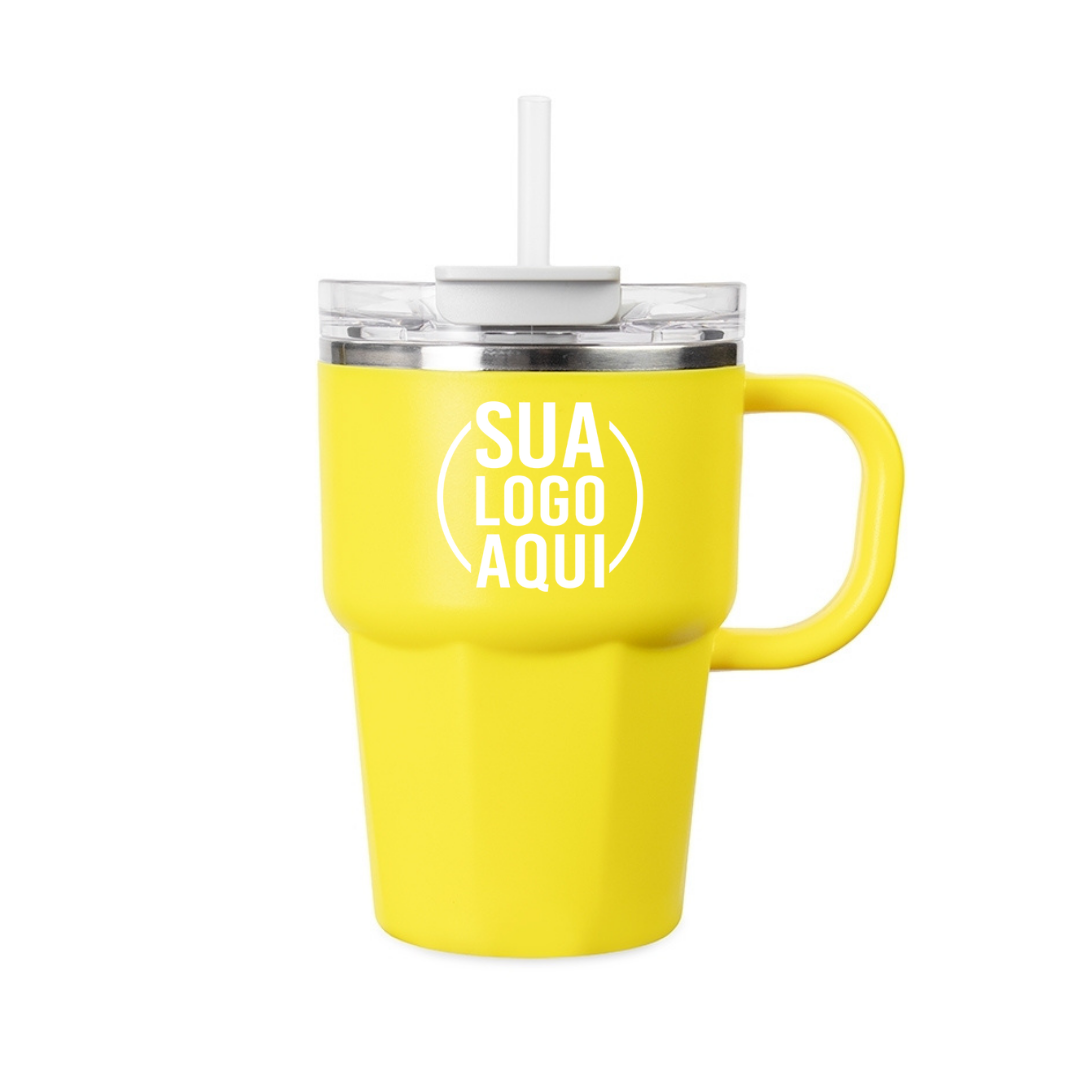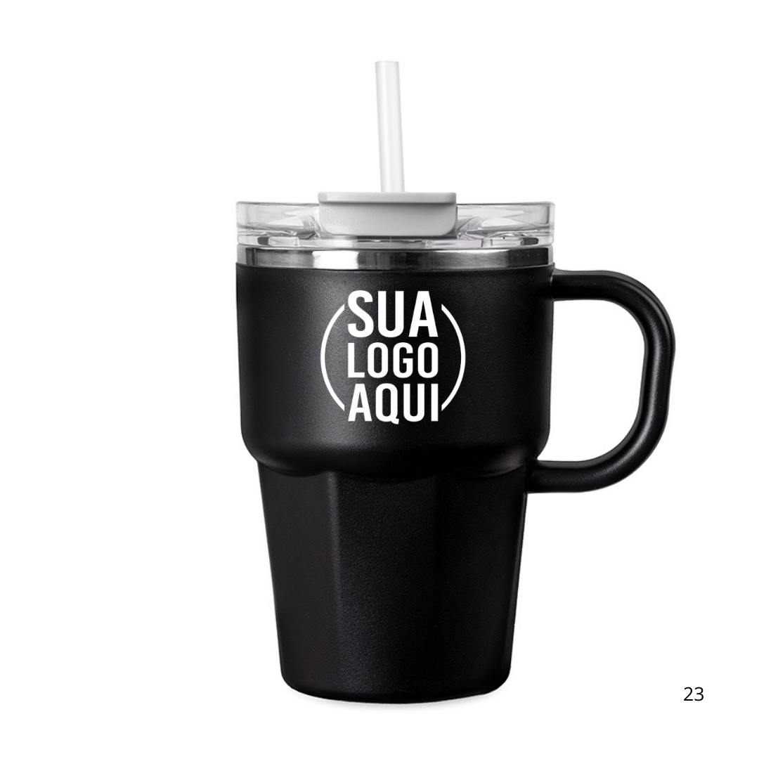 Caneca de parede dupla com interior em inox 304, revestimento externo e alça em plástico polipropileno (PP) e capacidade máxima de 550ml. Possui tampa de pressão em AS com protetor para o bocal em PP, além de acesso para canudo e anel de vedação em silicone, permitindo duas formas de consumo de bebidas. Acompanha canudo plástico.