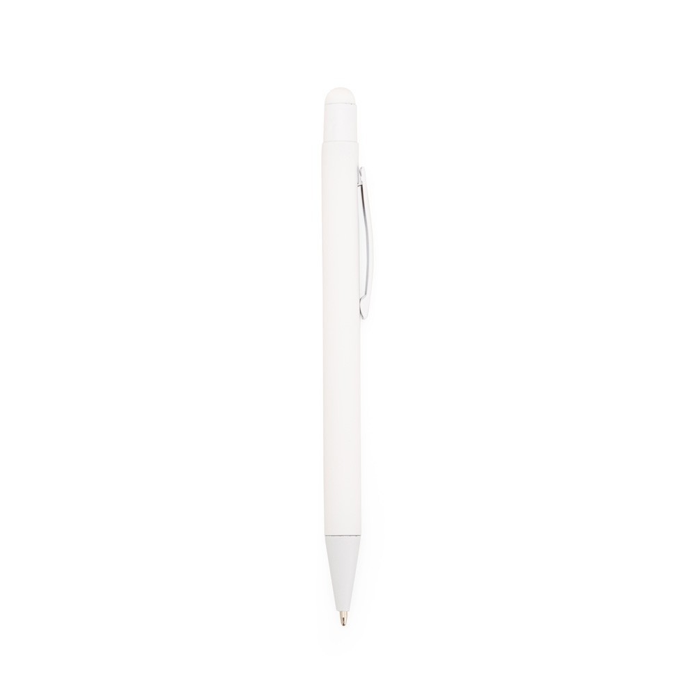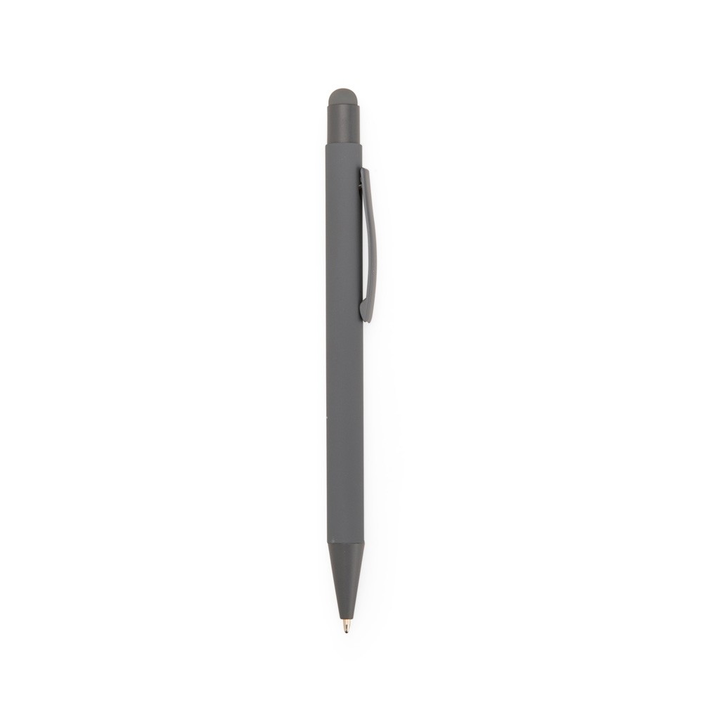 Caneta metálica com pintura de acabamento emborrachado. Possui acionamento por clique com detalhe emborrachado no topo para interação com dispositivos com telas sensíveis ao toque, além de carga esferográfica azul de 1,0mm.