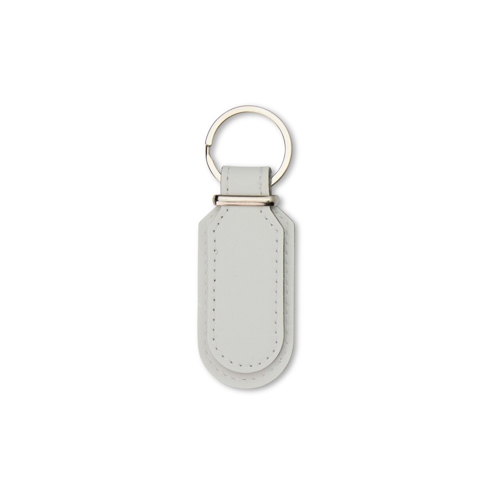 Chaveiro em formato minimalista em couro sintético com frente e verso lisos e argola de ferro niquelado.