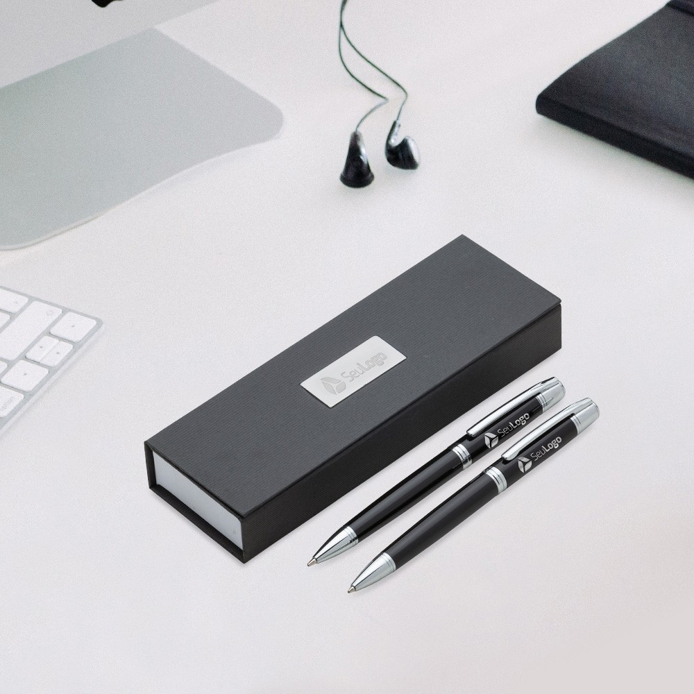 Conjunto caneta e lapiseira em estojo de cartonagem com placa central para personalização. Clip metal com dois anéis em relevo, anel centralizado e dois anéis em relevo na ponteira e acionam por giro. Estojo revestida com espuma na parte interna.