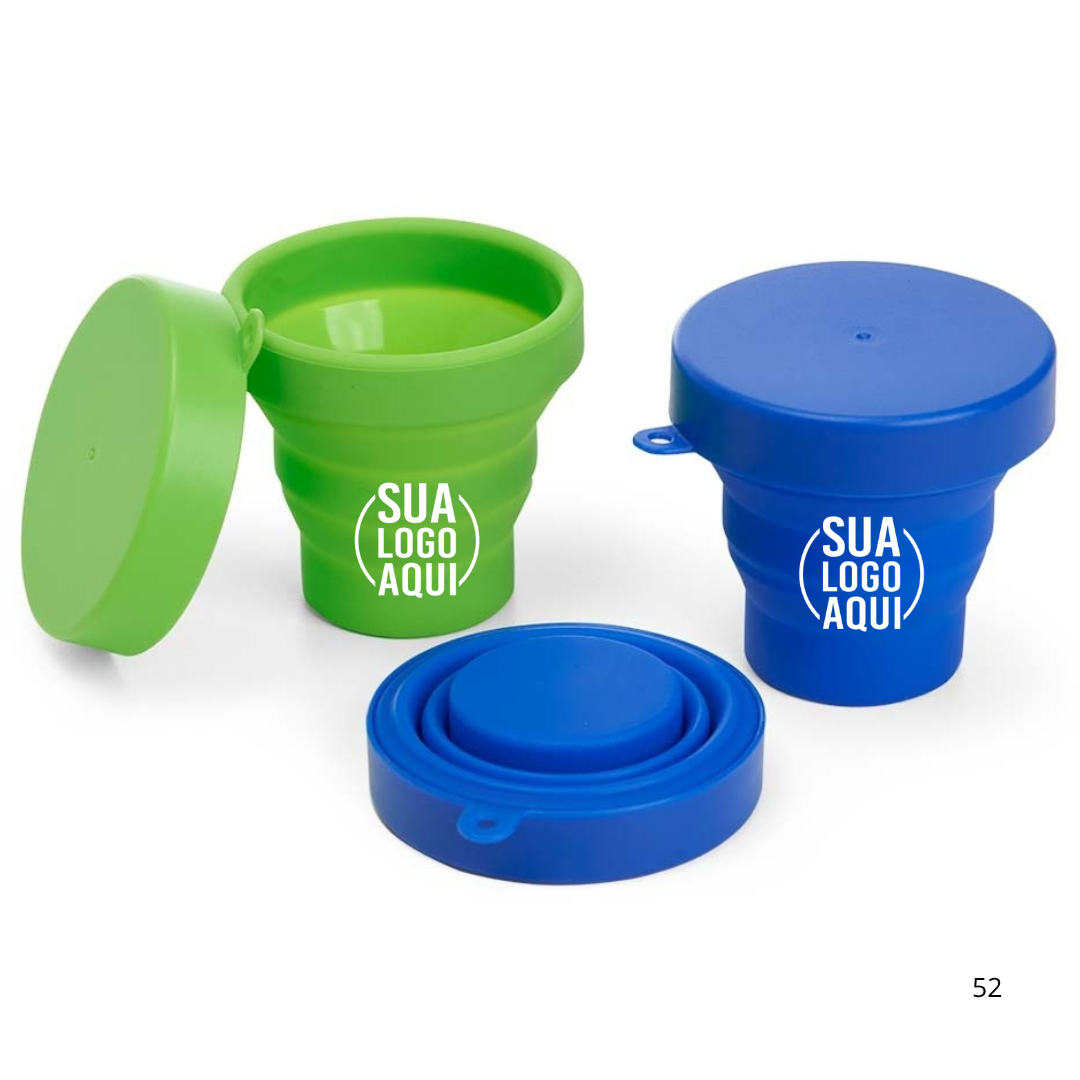 Copo retrátil em silicone livre de BPA com capacidade de 150ml. Acompanha tampa em plástico de encaixe com acesso para chaveiro.