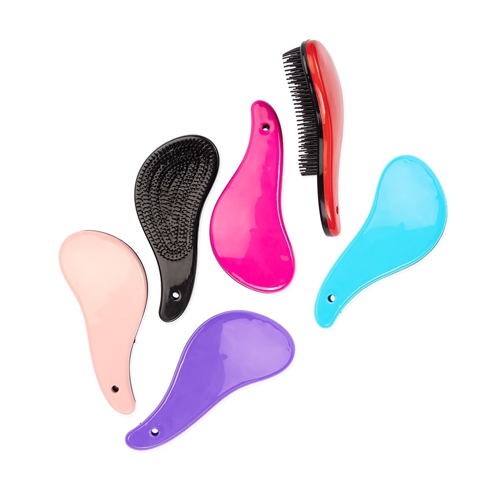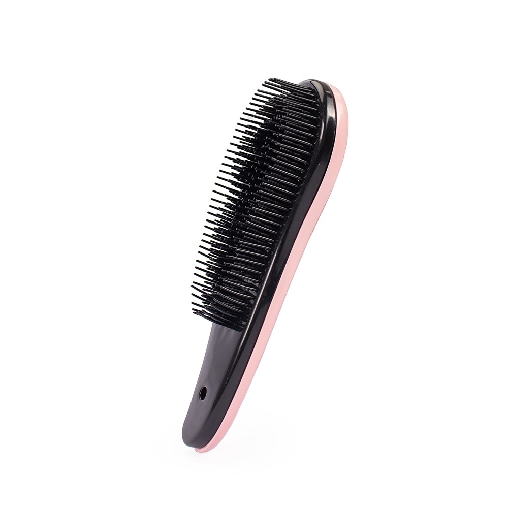 Escova plástica com design ergonômico e cerdas flexíveis posicionadas em dois níveis diferentes, oferecendo um pentear mais suave e desembaraçante sem puxar ou danificar os fios de diferentes comprimentos e curvaturas.