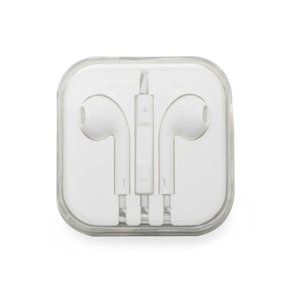 Fone de ouvido estéreo com microfone e controle de volume. Fone de ouvido plástico na cor branca, entrada P2, possui indicativo L(left) e R(right) na área interna do fone, detalhes internos vazados no fone(possibilita a visão da tela de proteção), microfone acoplado no suporte com desenho indicativo e no verso do suporte controle de volume com desenho indicativo – e +. Acompanha embalagem plástica branca com tampa acrílica transparente. OBS.: Botões de volumes funcionam apenas em aparelhos da linha APPLE.