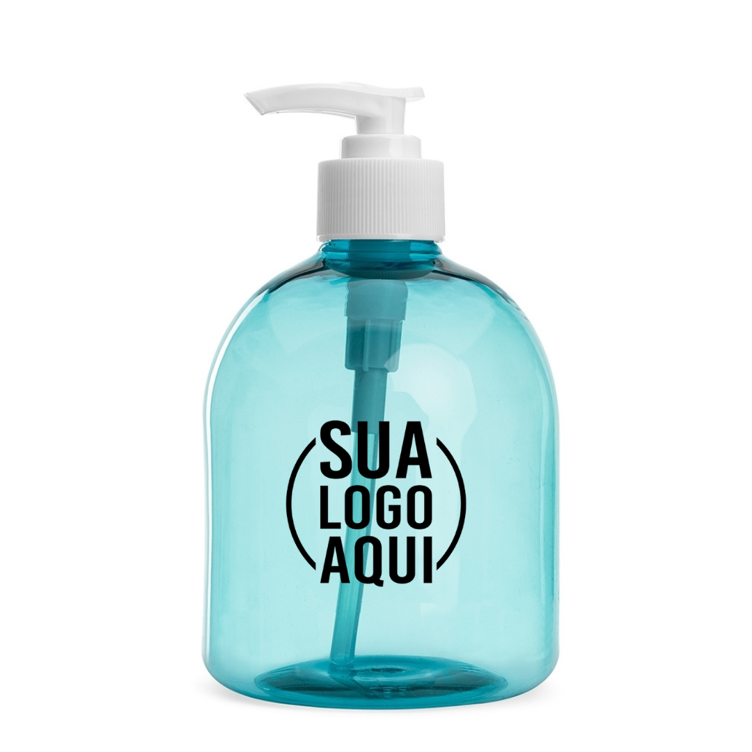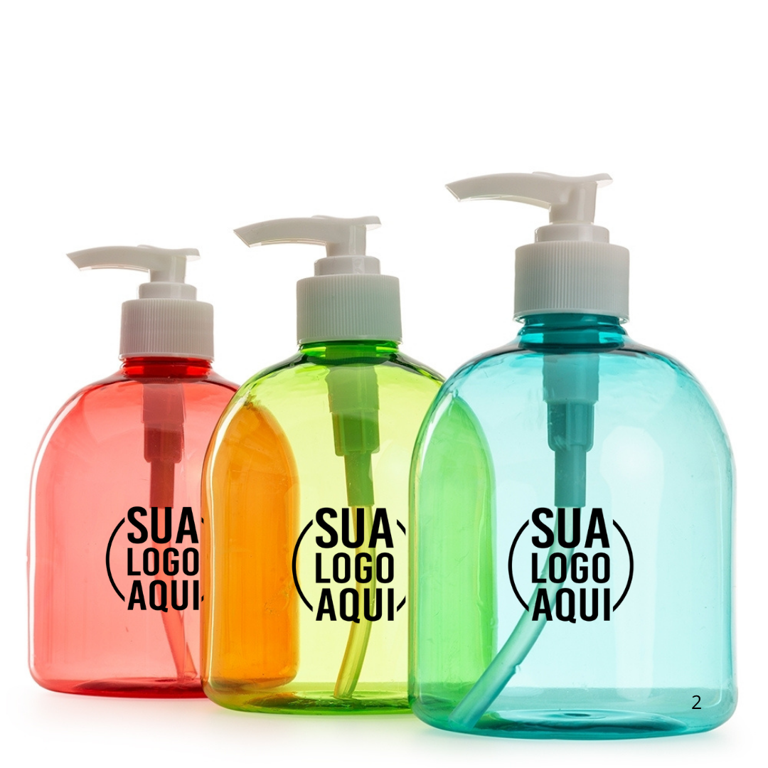 Frasco 480ml produzido em plástico colorido, tampa rosquável com válvula pump e trava de segurança, basta pressionar e girar a parte superior para travar o produto.