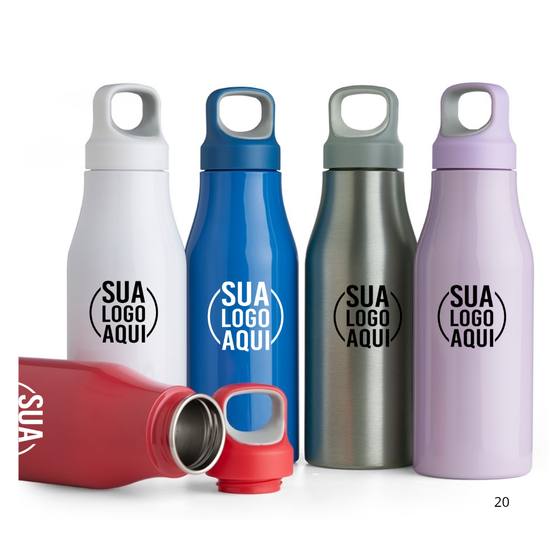 Garrafa 650ml em inox com tampa rosqueável com alça para transporte.