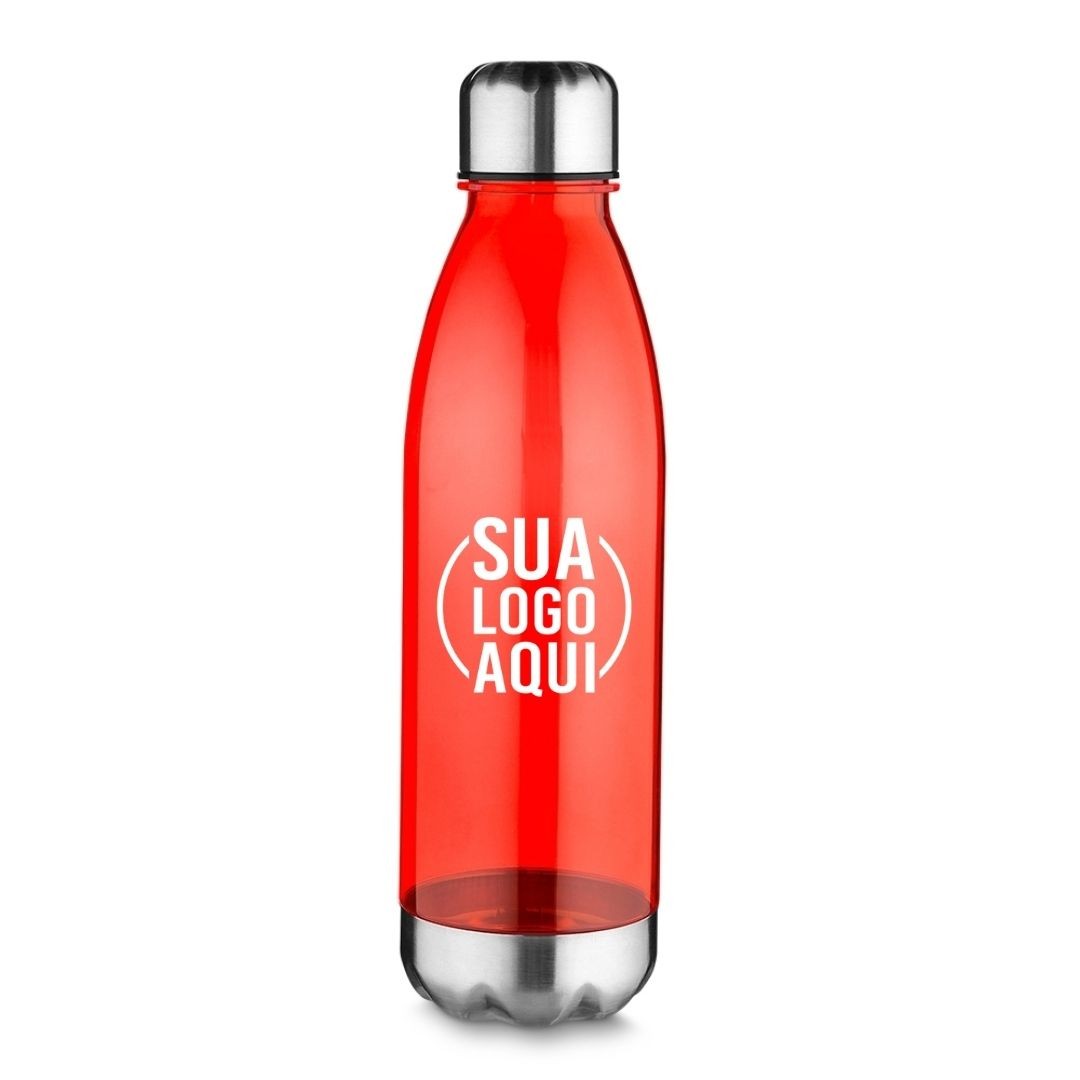 Descrição: Garrafa Plástica 700ml. Corpo transparente colorido, possui tampa e base em alumínio.