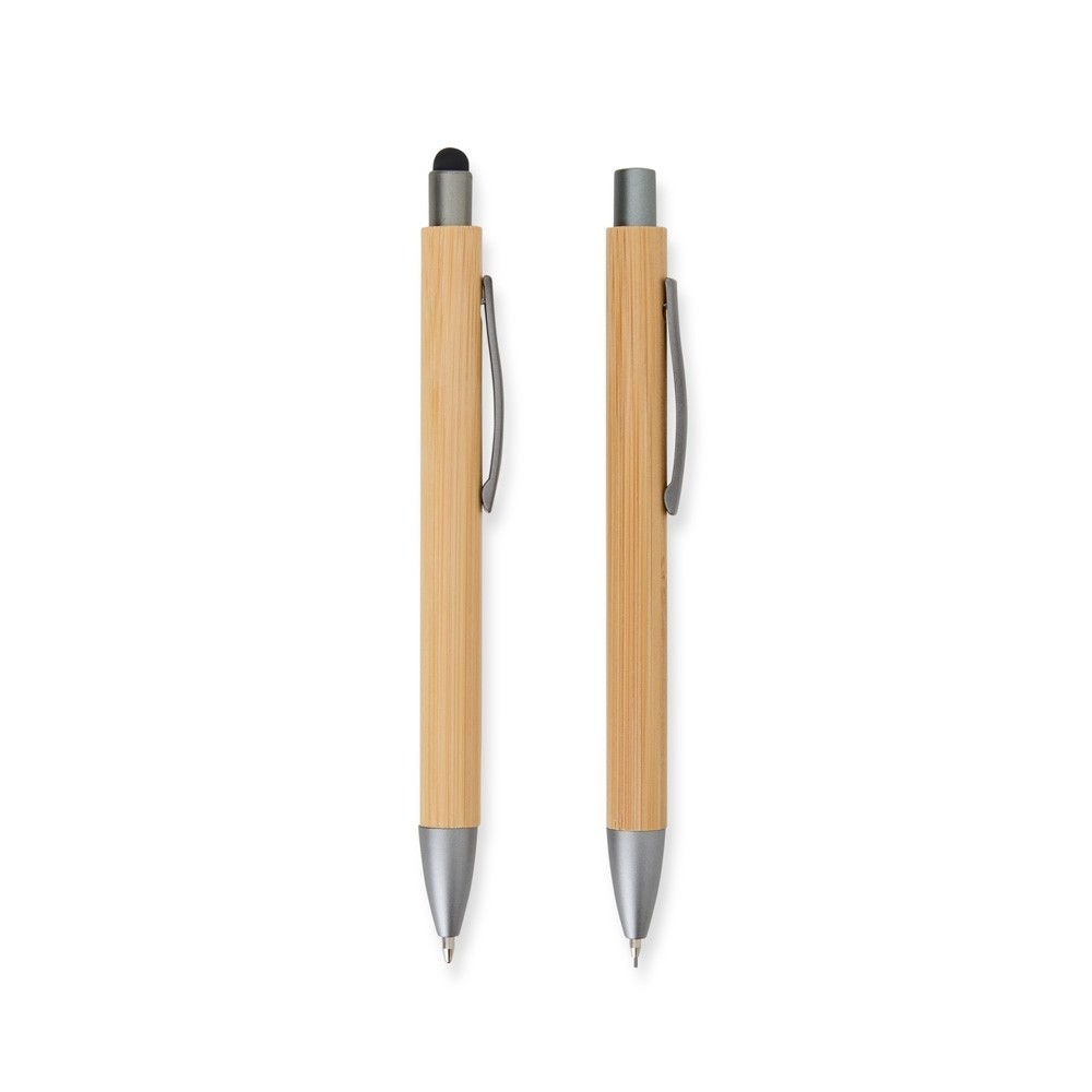 Nosso Kit Ecológico de Caneta e Lapiseira de Bambu é excelente para quem busca um toque sustentável no dia a dia. A lapiseira possui acionamento por clique, e a caneta conta com carga esferográfica azul de 1.0mm e função touch para quem precisa de toques precisos em dispositivos. Além disso, acompanha uma embalagem que imita bambu. Uma ótima escolha para presentes corporativos ou para quem ama escrever sem abrir mão da consciência ecológica!