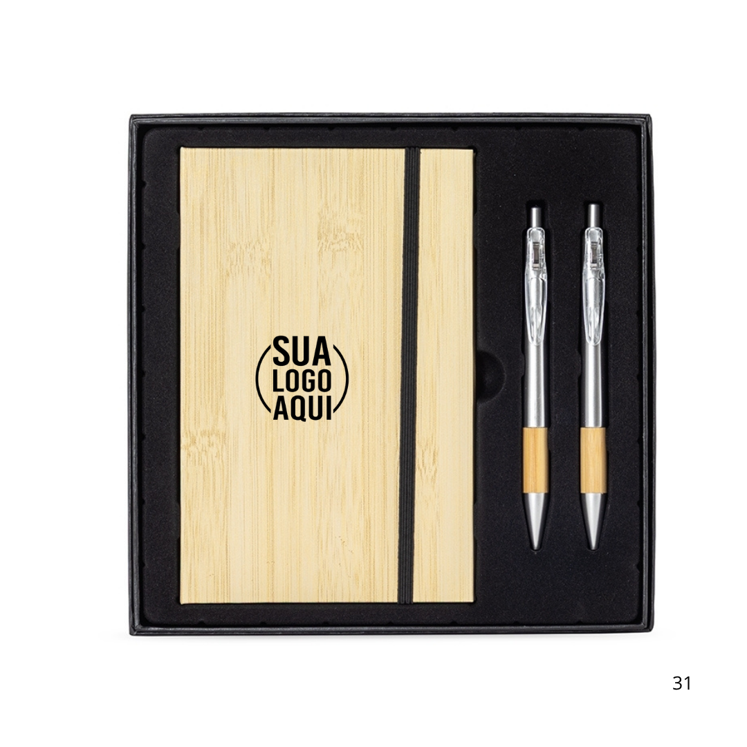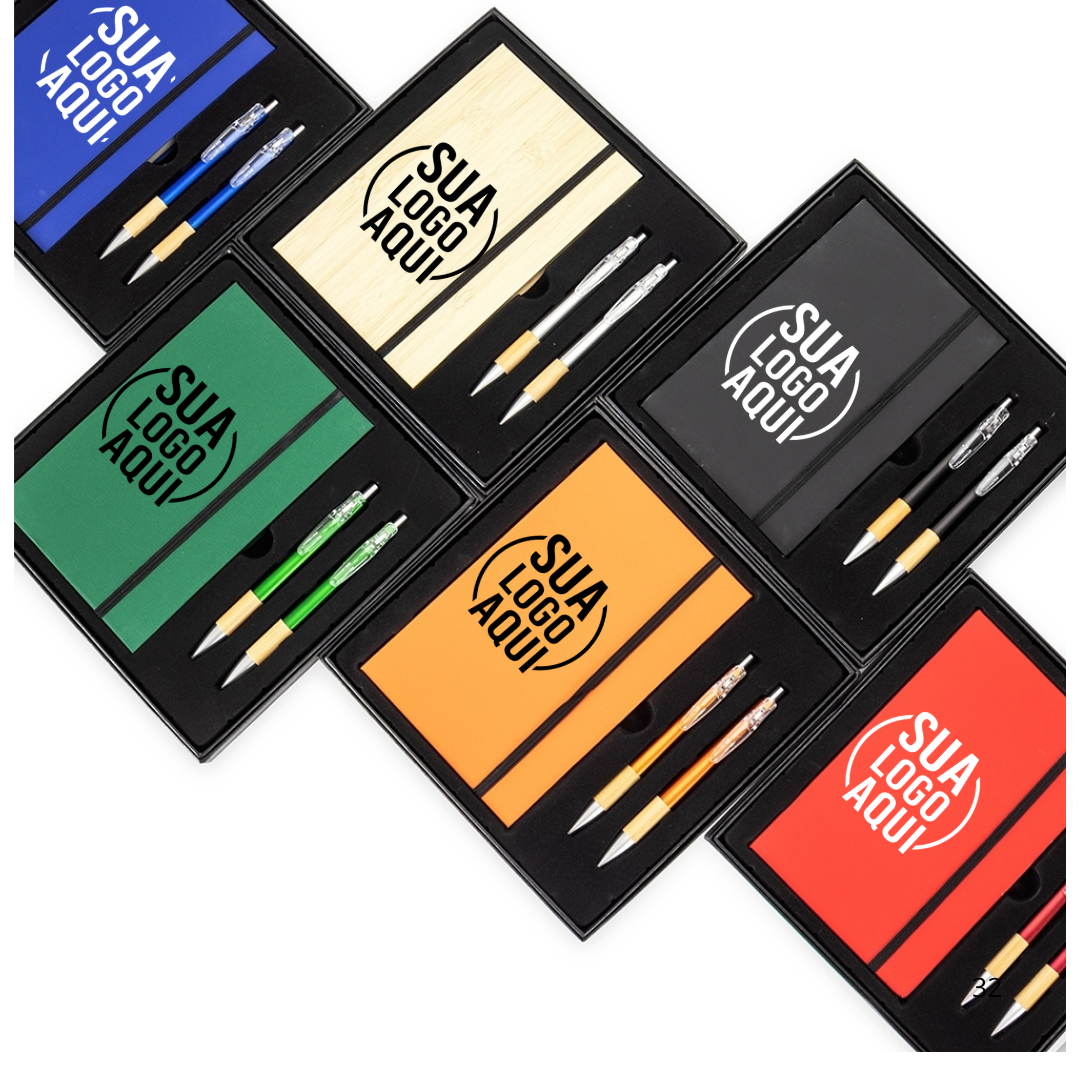 Kit executivo com três peças, composto por uma caderneta, uma caneta e uma lapiseira. A caderneta possui capa dura em papelão reforçado, fechamento em elástico, cerca de 82 folhas pautadas, bloco de folhas amarelas e outro com marcadores autoadesivos coloridos. A caneta e a lapiseira contam com corpo em plástico e detalhes em bambu. Além disso, a caneta possui carga esferográfica azul de 1,0 mm, enquanto a lapiseira dispõe de grafite de 0,7 mm. Acompanha caixa em papelão com berço em plástico para guardar os itens do conjunto.