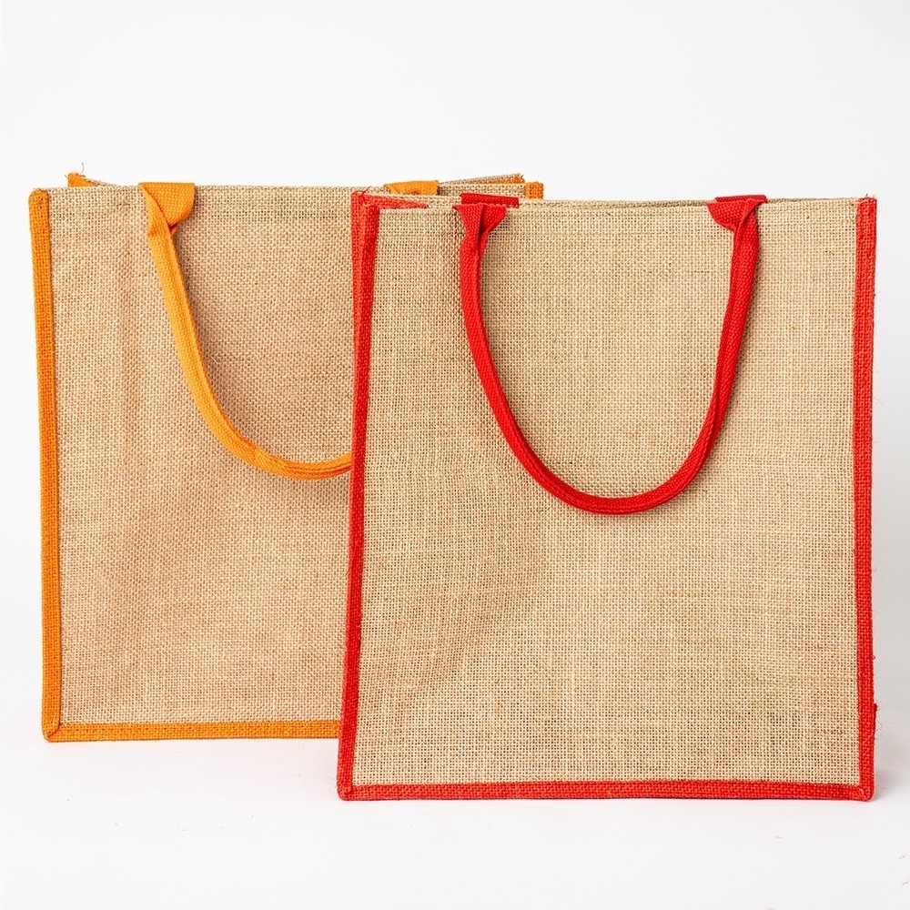 Sacola ecológica confeccionada em juta com alças costuradas na parte interna.